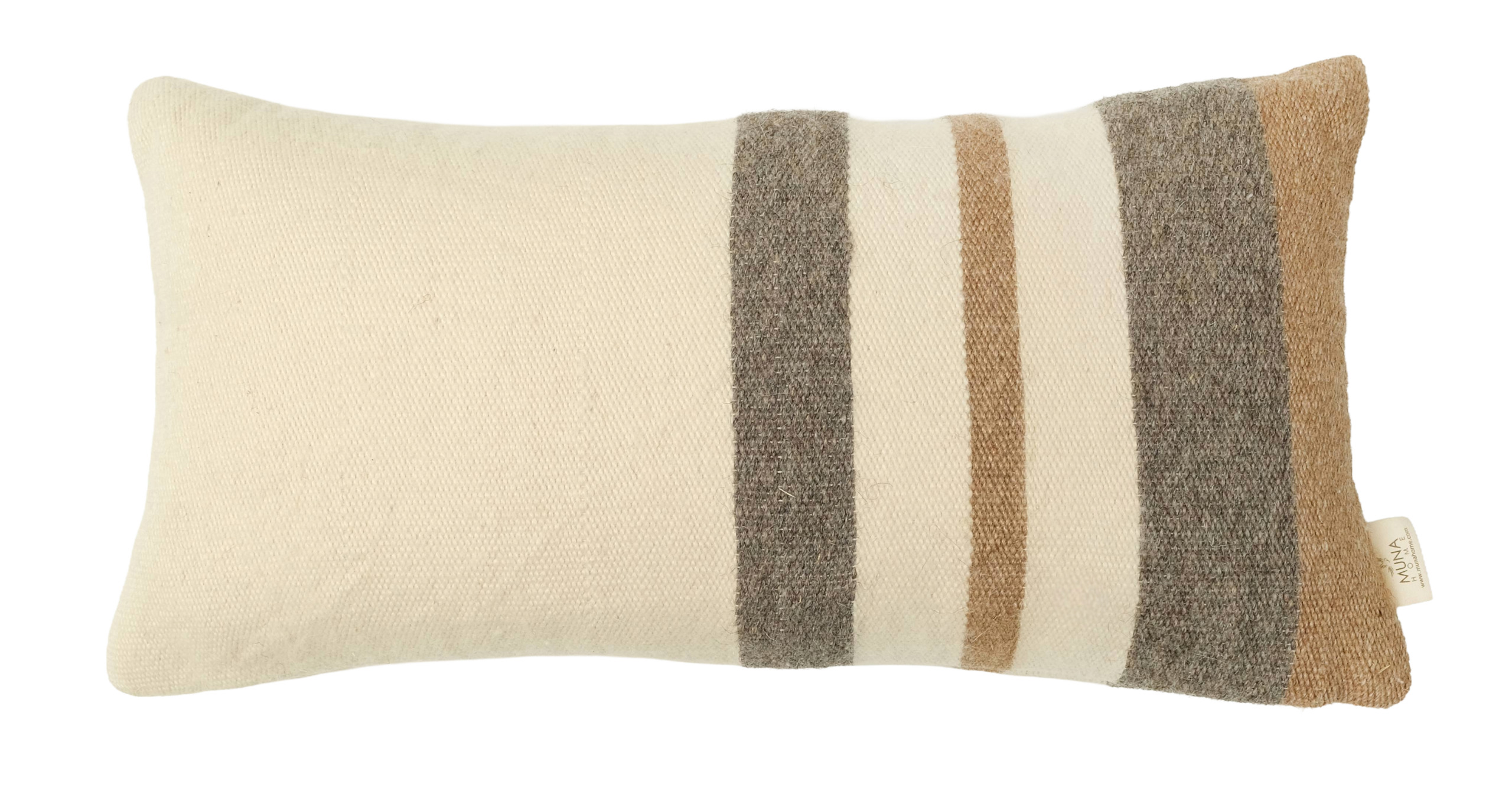 %100 doğal yünden el dokuması olarak üretilmiş bu dikdörtgen dekoratif yastık, beyaz, camel ve gri meta çizgileriyle dengeli ve modern bir görünüm sunar. Zamansız tasarımı sayesinde İskandinav ve doğal dekorasyon stilleriyle kolayca uyum sağlar.