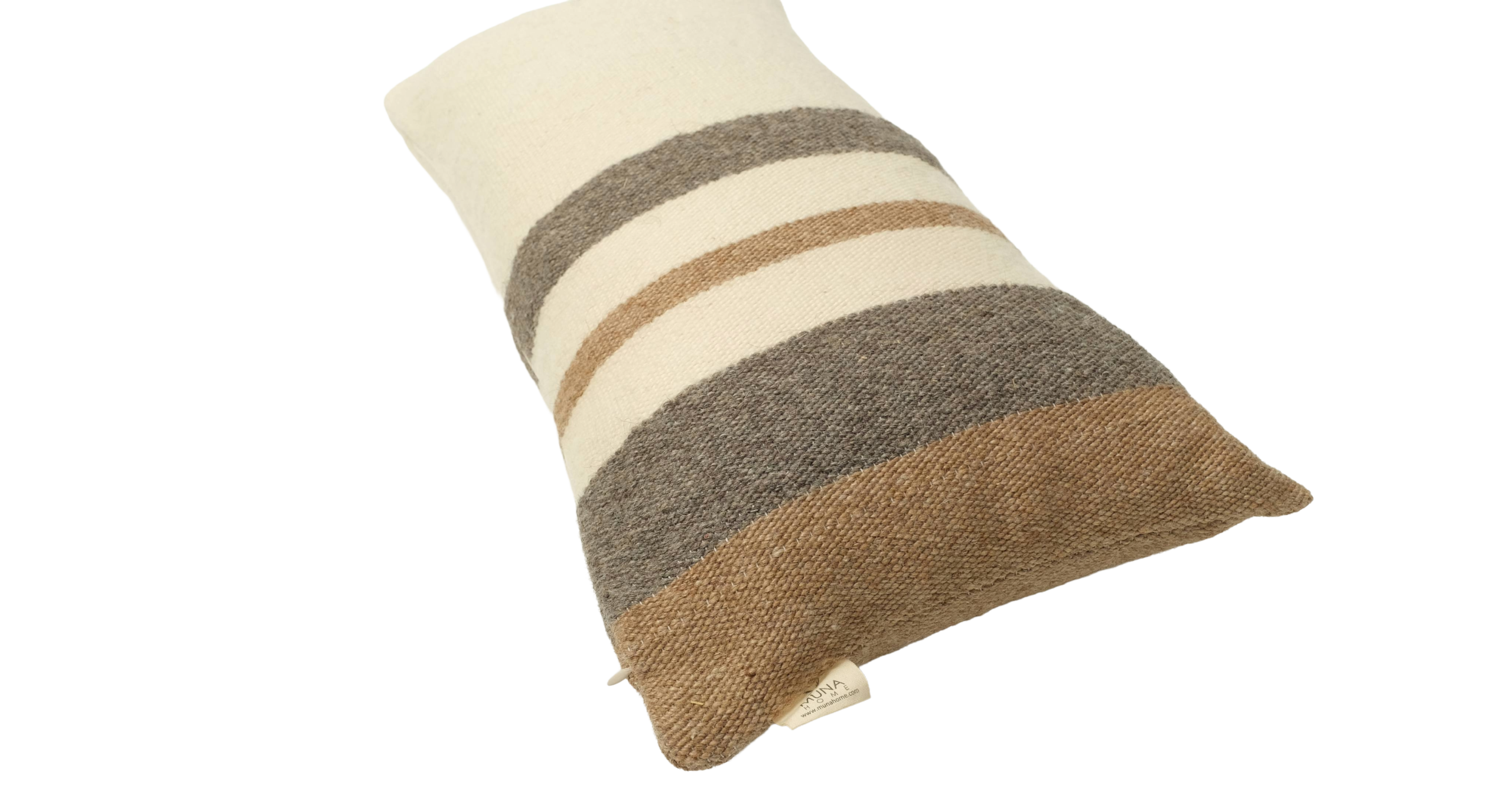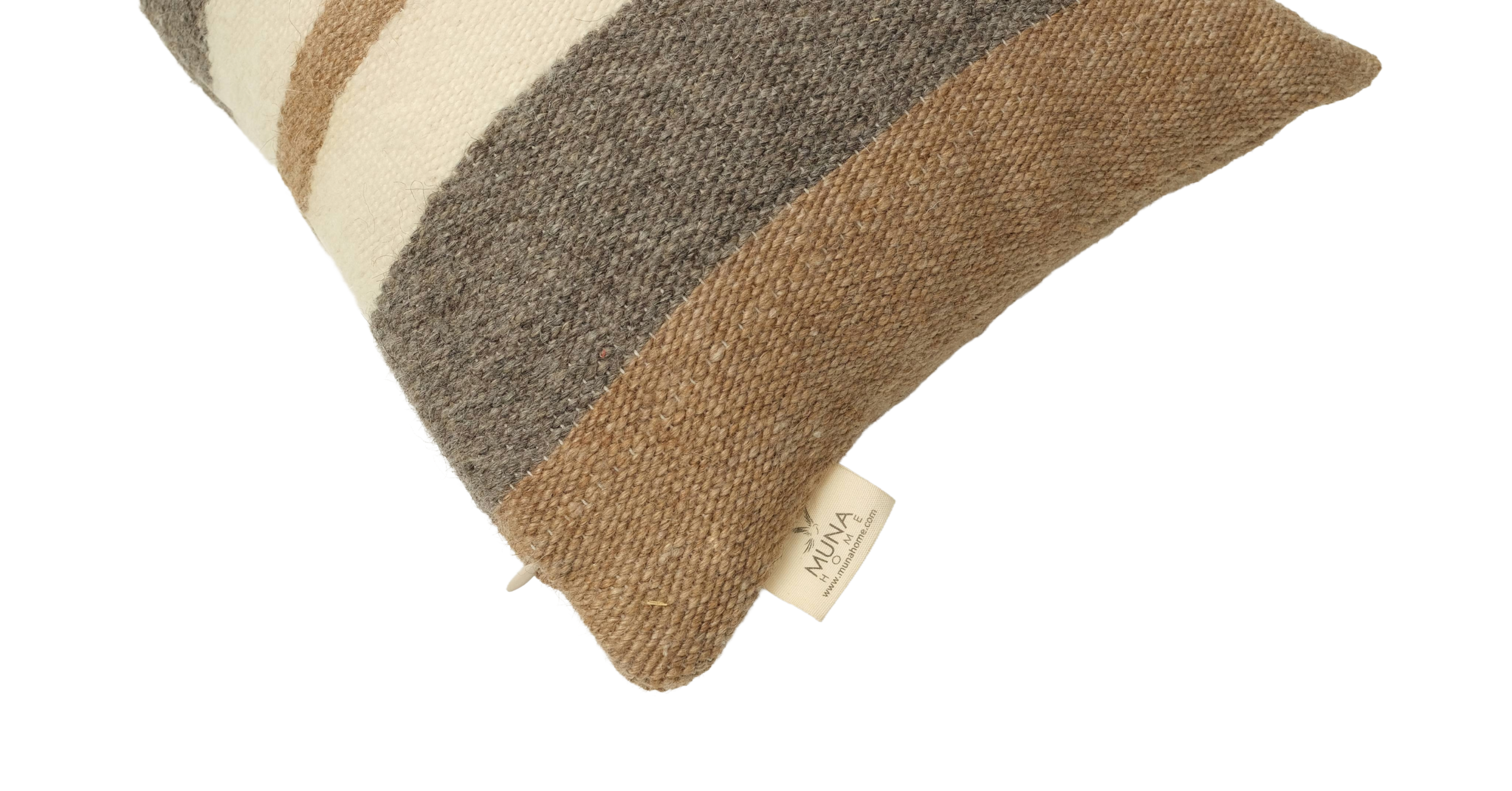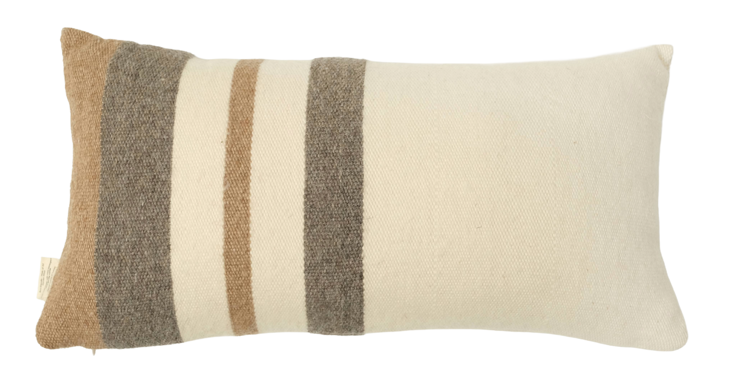 El Dokuması Yün Yastık – Toprak Tonları Meta Çizgili (Beyaz, Camel ve Gri)