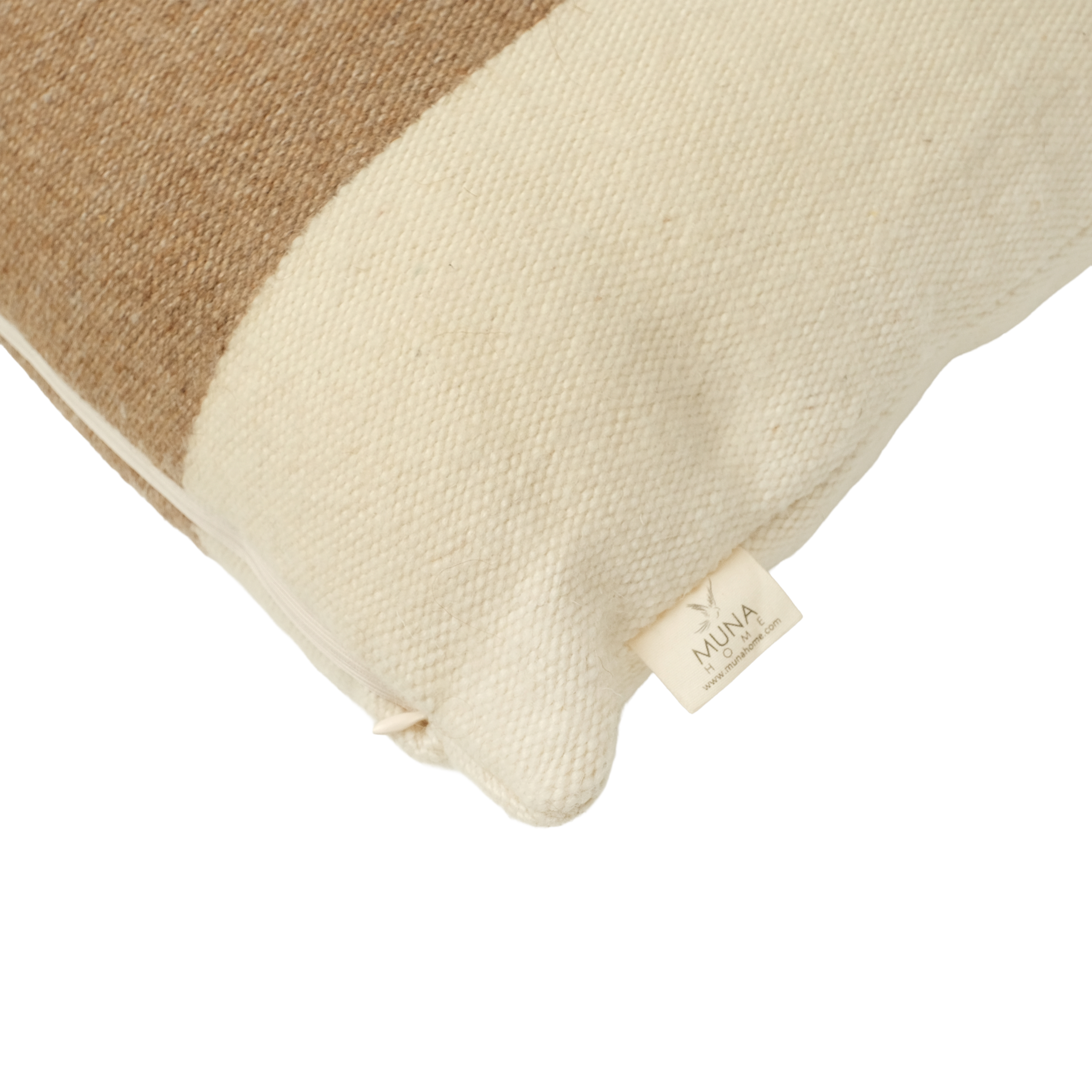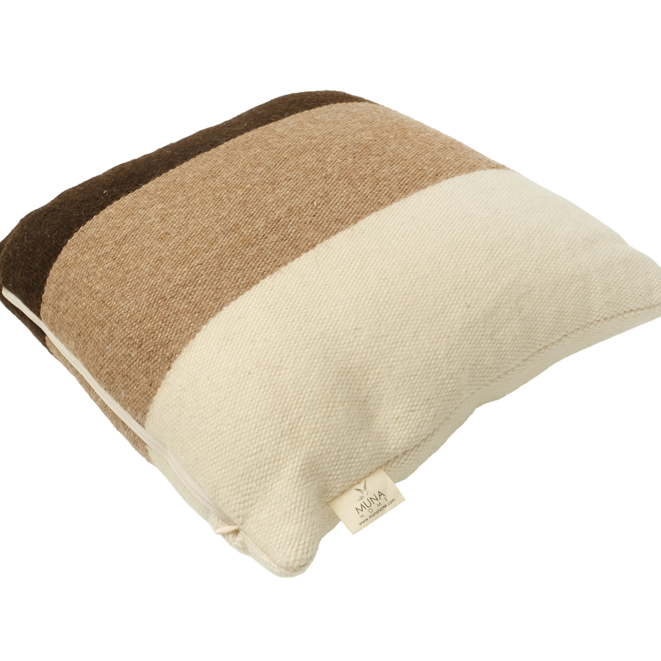 El Dokuması Yün Kare Yastık – Toprak Tonları Panel Çizgili (Beyaz, Camel ve Kahverengi)