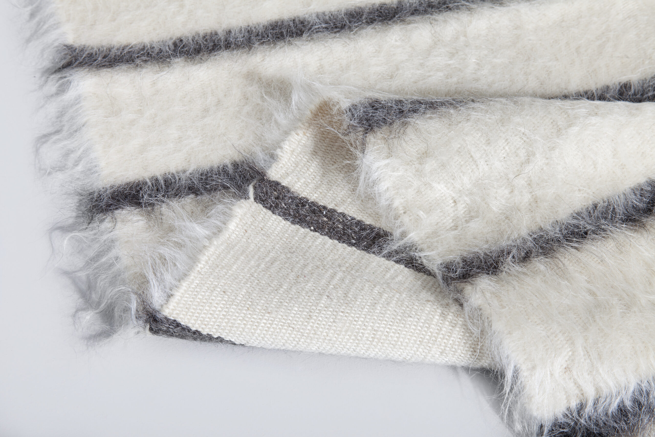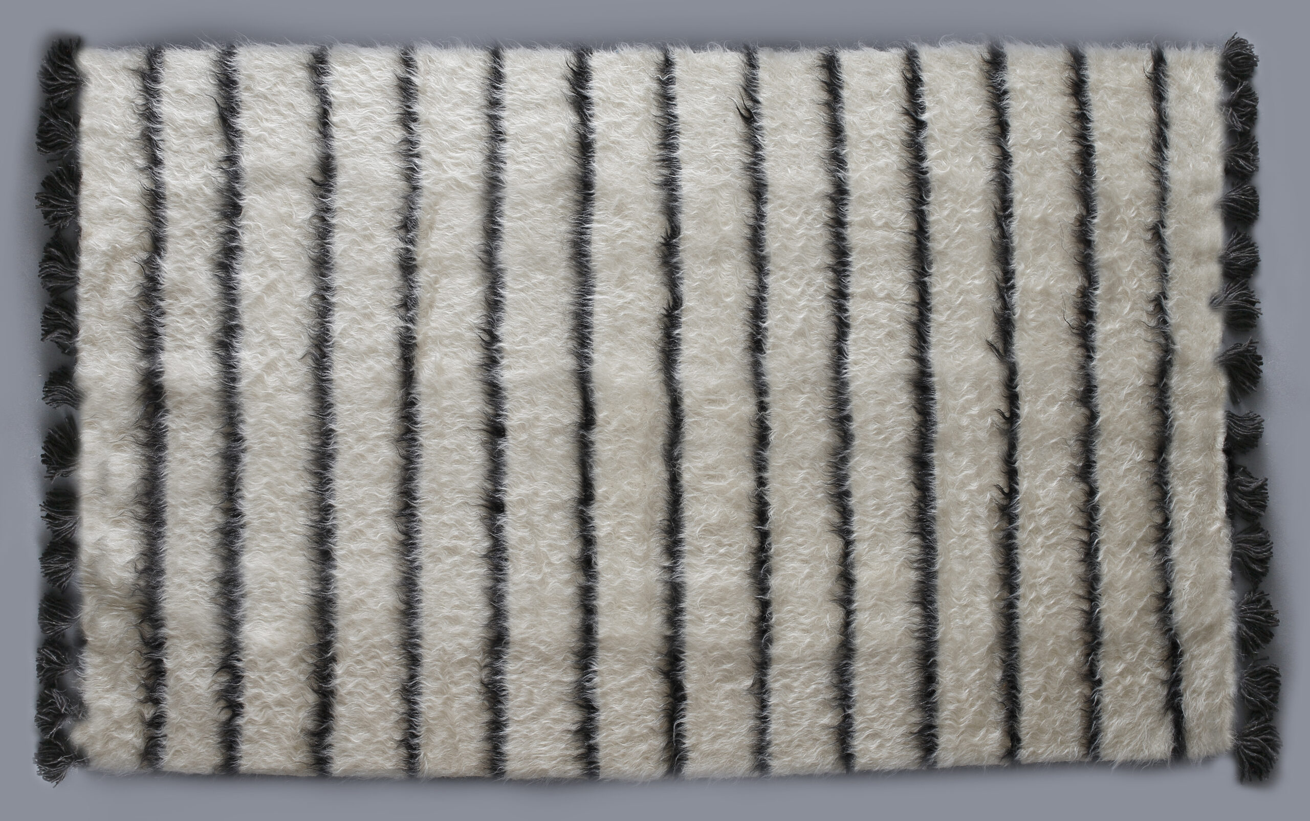 Mohair ve doğal yün karışımıyla üretilmiş el dokuması ince çizgili kilim.