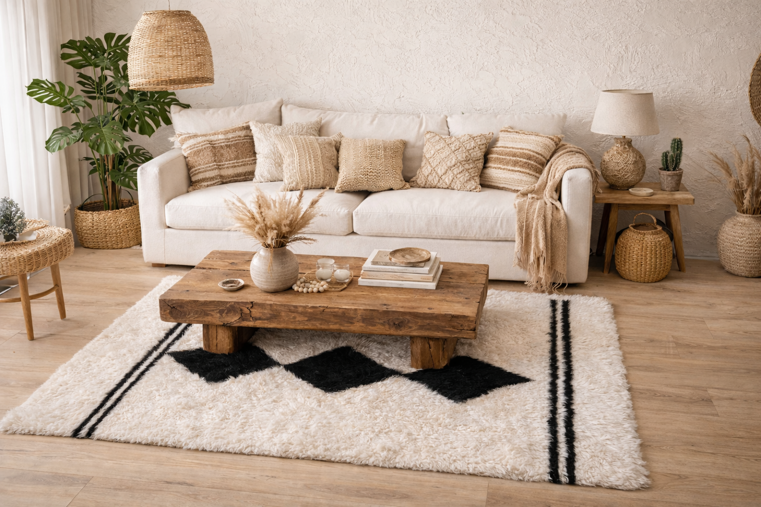 Our hand-woven Rhombus rugs, produced using a blend of mohair and natural wool, are woven by combining hand-spun mohair from Angora goats with selected natural wool. The fibers are left undyed; the natural contrast of black and white is preserved, offering a timeless look.