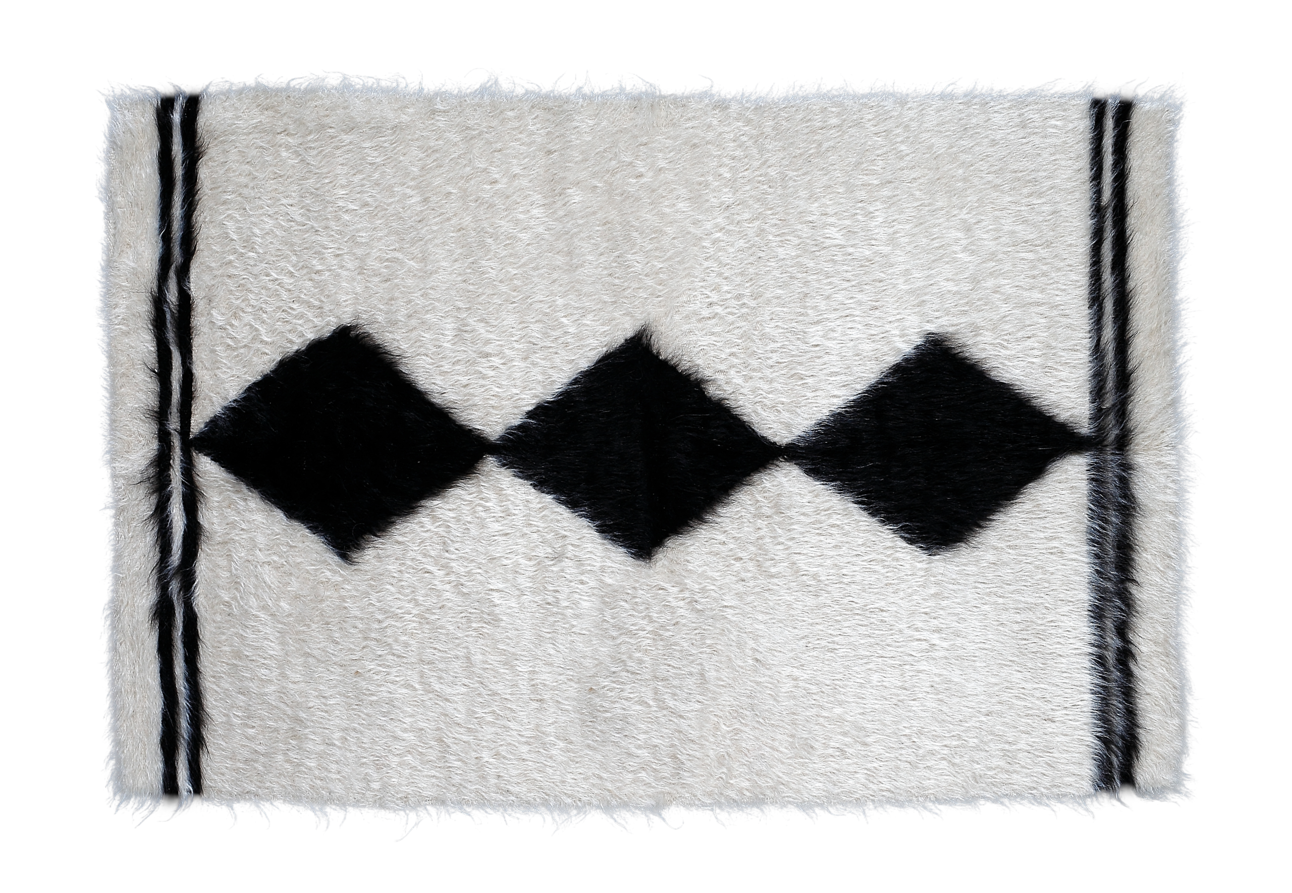 El dokuması Mohair & doğal yün karışımı Rhombus kilim. Siyah ve beyazın doğal kontrastı ile zamansız, dayanıklı ve çok yönlü kullanım sunar.